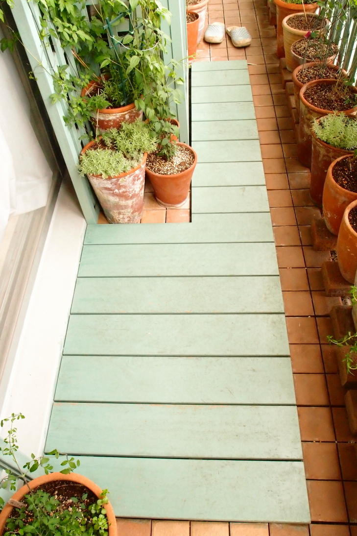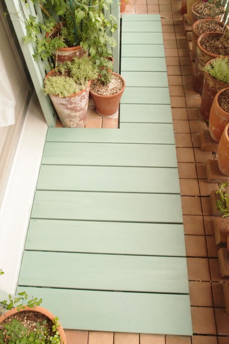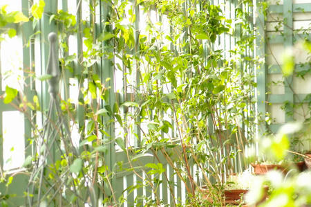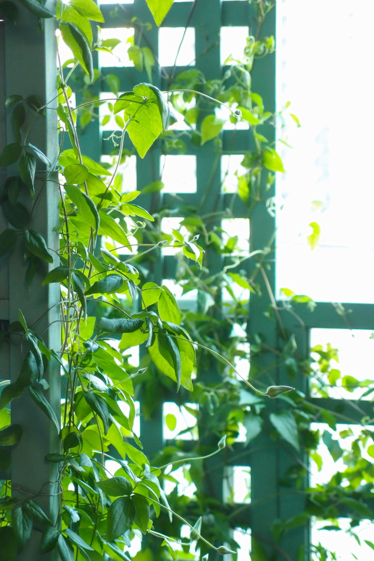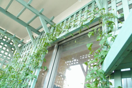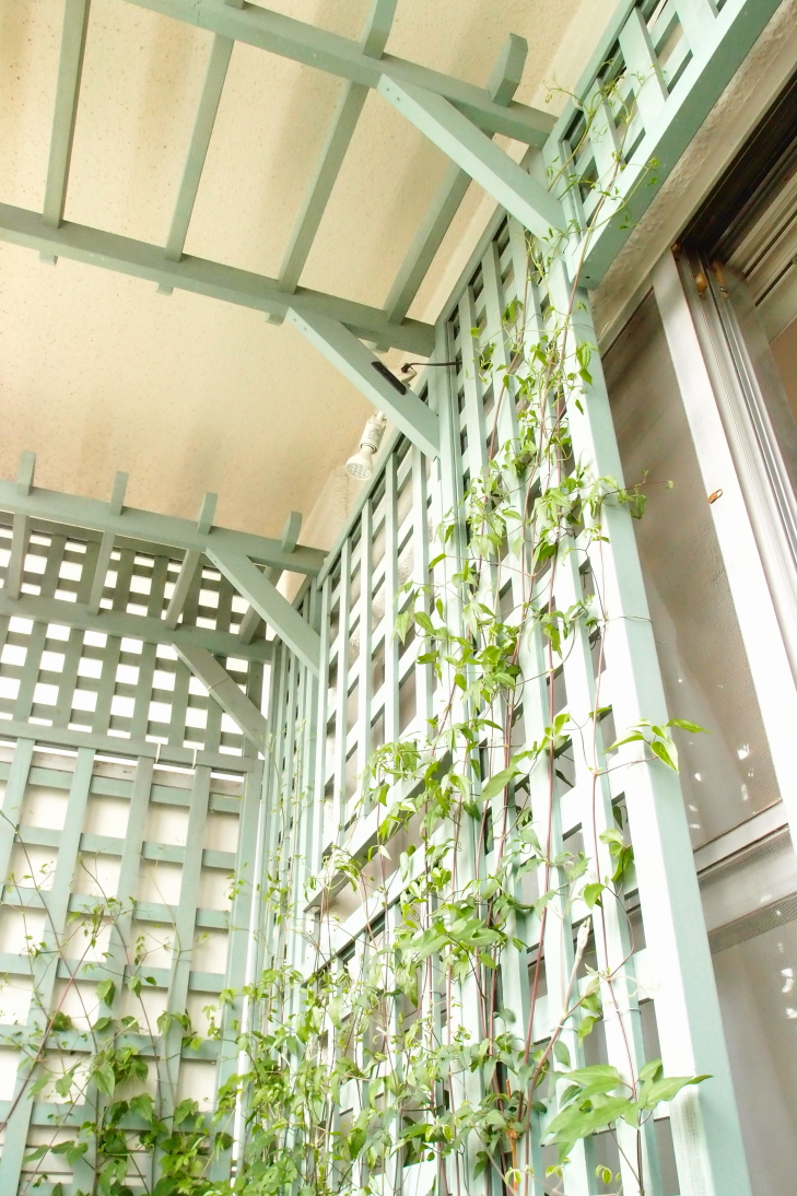 ベランダの出入り口にあたる部分の左右から蔓を這わせて