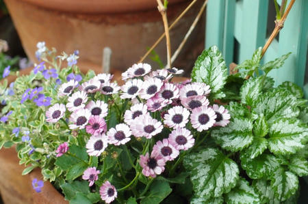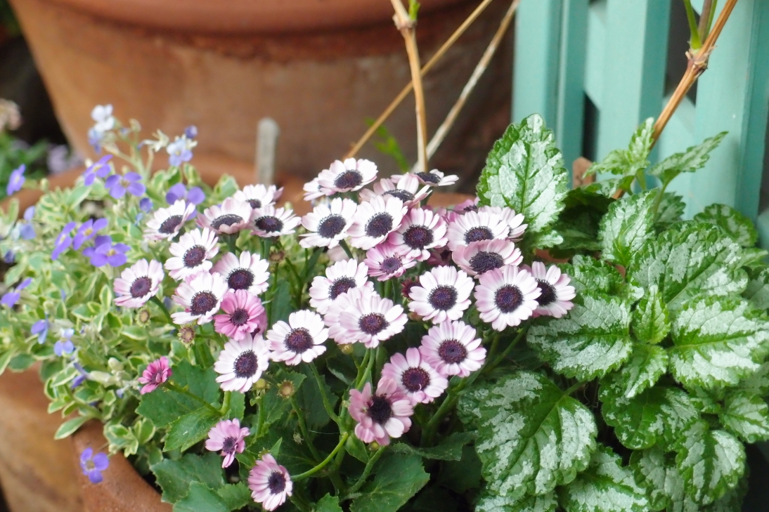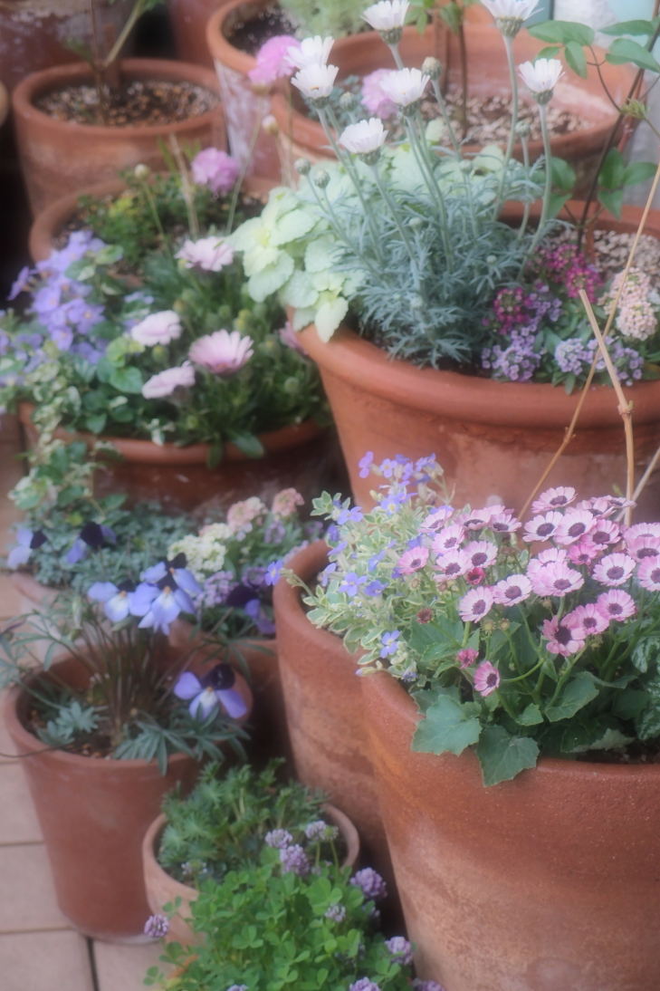奥の鉢は昨年も寄せ植えを楽しんだロコ-コラの鉢なのですが