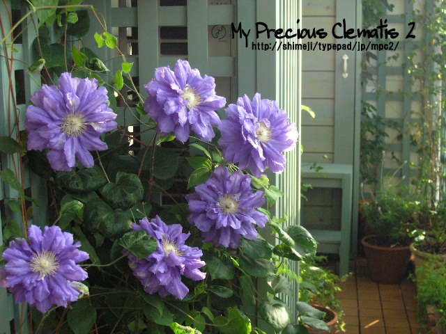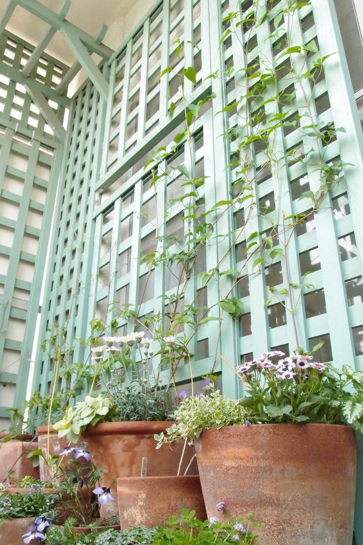 下の写真右側の大きな鉢2つはクレマチスと季節の花が寄せ植えになっています。
