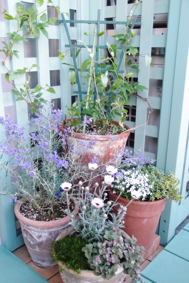 写真はエアコン室外機横スペースのクレマチス&春の賑やかし寄せ植えコーナー。