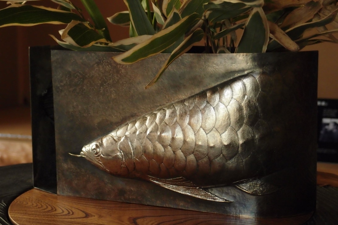 このシルバーアロワナを打ち出した花器も秋濱克大さんの作品です。