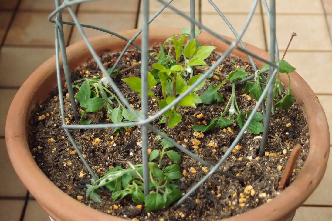 購入後テラコッタ鉢に植え替えミニオベリスクに旧蔓を止め付け