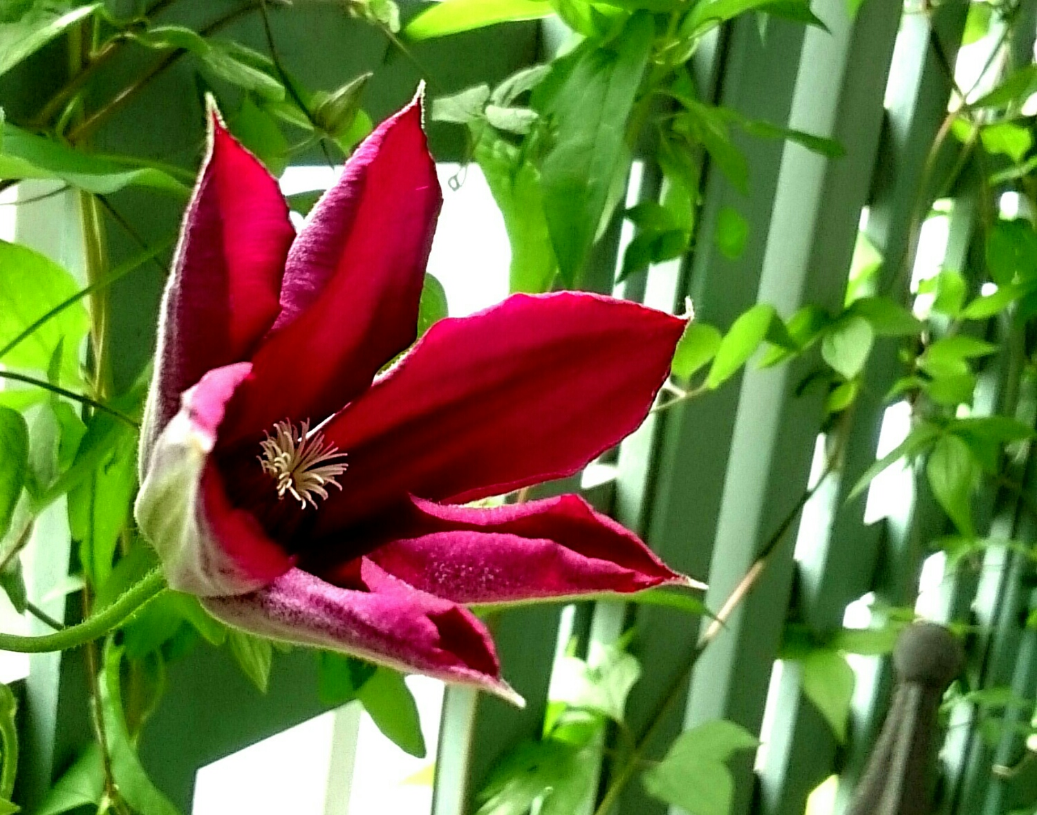シックな赤い花弁にしべも紅色の端正なクレマチス。