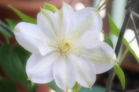 シベも白くて清楚な雰囲気の花ですね~、クレマチスは同じ白花でも花弁に重なりがあったり筋が入ったりで印象が全然違って見えたりするから面白いですよね。