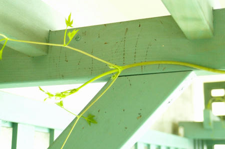 この後カイウの蔓はパーゴラの桁の向こう側に避難させました!